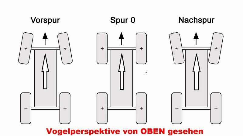 Und hier noch ein paar kurze aber dennoch wichtige Informationen, was genau diese Werte eigentlich bewirken. Die Definition der einzelnen Kategorien sehen Sie jeweils unter den Darstellungen.Einfache Darstellung von Vorspur (+), Spur 0 und Nachspur (-)